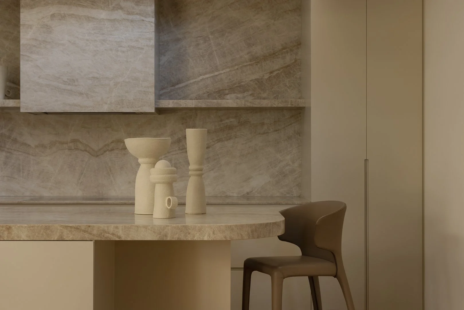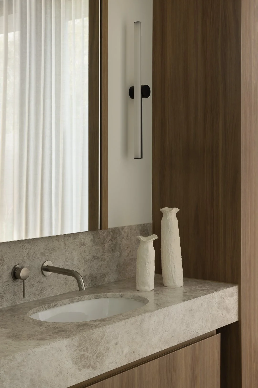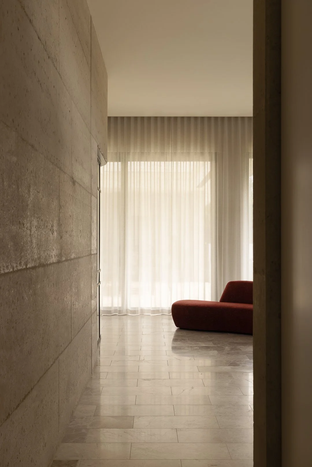 The facade and interiors are formed from rammed earth walls, giving the house a strong sense of permanence and warmth. Monolithic forms are softened by planting, while interiors unfold in layered textures, filtered light, and carefully curated moments.